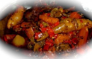 Then throw in pearl onions, whole, with chopped red bell pepper. You can also do this before the beer is added; depends on how much you need a release of the searing liquid that is practically at a burning stage– The beer is a life savour for the pot and the liquid from the seared meat, what is left in the pot. It chooses for you.
