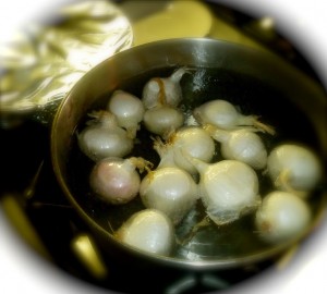 Already have your vegetables and seasonings prepared as much as possible, the garlic minced– 3 cloves; and pearl onions dunked in boiling water, submerged for 2 minutes only, then taken out of the hot water for the peelings to be easily slipped right off… easily done after that point.