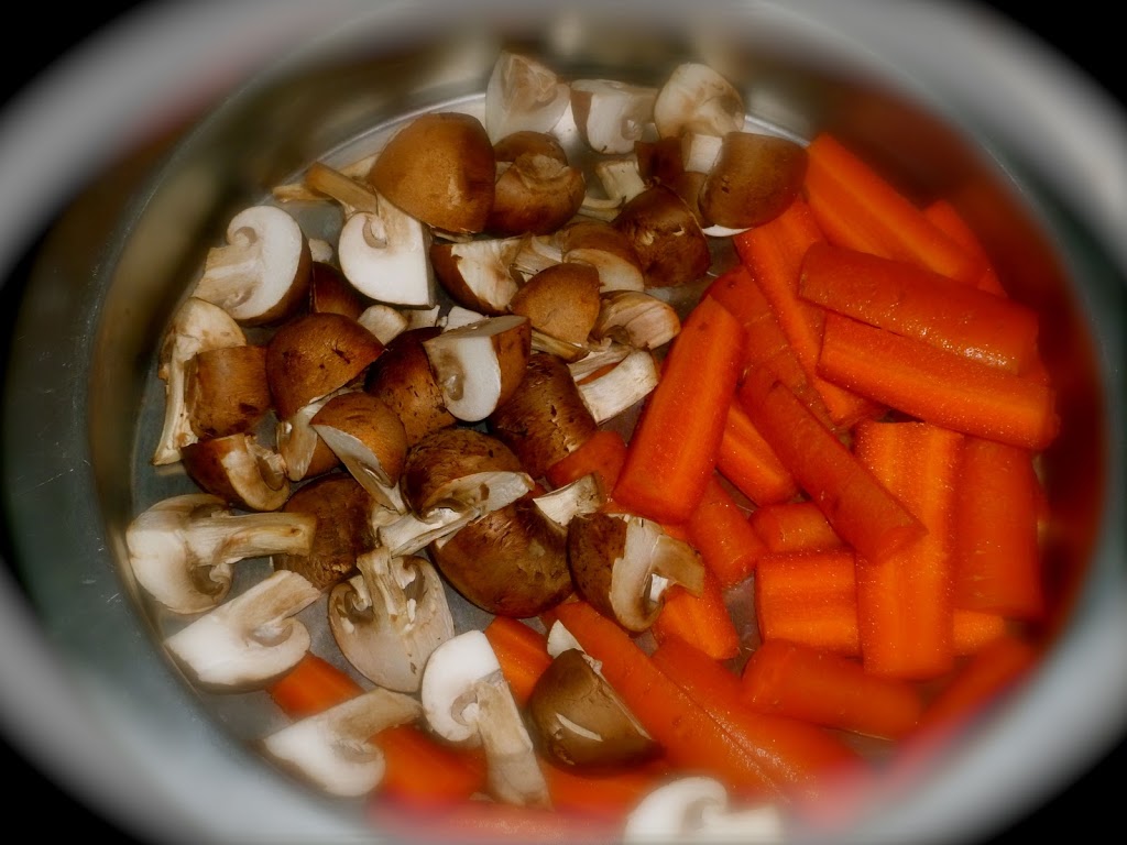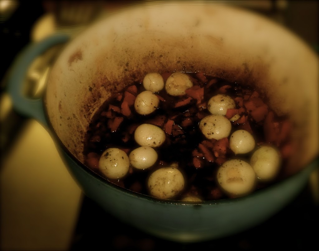 Already have your vegetables and seasonings prepared as much as possible, the garlic minced– 3 cloves; and pearl onions dunked in boiling water, submerged for 2 minutes only, then taken out of the hot water for the peelings to be easily slipped right off… easily done after that point.