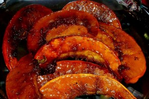 Do not leave in the oven, long, just so that the peelings do not get tough, remember!– just long enough for a glaze to form over the acorn wedges.  Stir gently.  Keep a close watch.