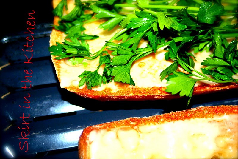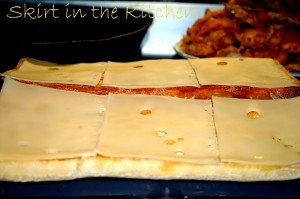 Take bread from the broiler, line with swiss cheese, and place back into the broiler– quickly in, quickly out– a few seconds to slightly melt the cheese slices.