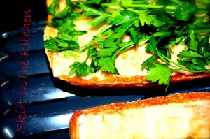 Lay cilantro over the top half of the ciabatta bread.  Build it backwards– sometimes it’s the process, not only the taste of the food, that makes it better– the way it’s put together, layered, sliced or cut.  Flip it in the end; will hold it together better for the arrangement…