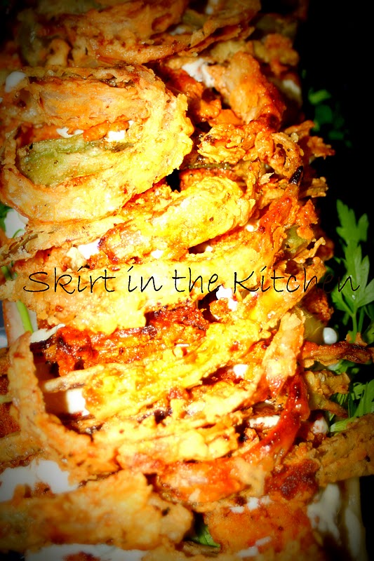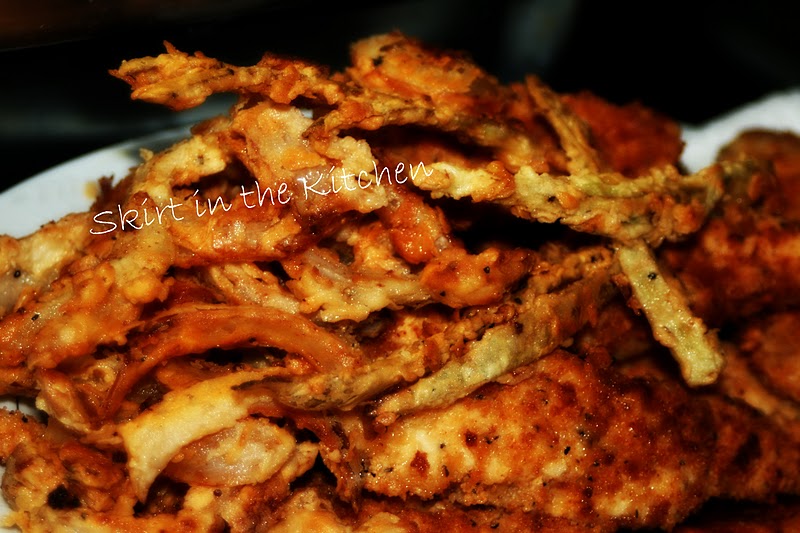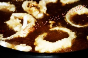 After batches of chicken have been fried, do not change out the oil; rather, add more oil to the skillet if need be.  The oil at this stage will give the onions remarkable flavor and crunch.  It’s ideal to fry onion strips/rings into; first, doing with them as you did with the chicken– into the egg batter, then into the flour with panko.