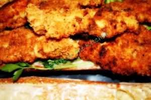 Have tenderized chicken cut into strips.  Dry them before dunking into egg batter, then into flour.  Do not double-dip.  Fry in hot olive oil.