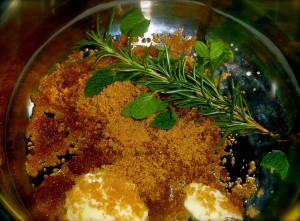 In a heavy pot or Dutch oven, melt and absorb in and through barely tender squash– when squash has been taken from the oven– place into a pot with a lid and the added ingredients:  2 tablespoons unsalted butter, 1/2 cup dark brown sugar, red balsamic vinegar, agave nectar, rosemary, mint, 6 ounces raspberries and garam masala.
