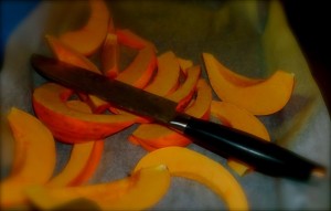 Wash to clean 1 acorn squash.  Cut into wedges, carefully.