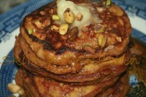 Heat a small skillet, add just enough butter to fry 1 pancake at a time. Keep warm in the lowest temp of the oven. Make the Honey Butter: 8 tablespoons softened unsalted butter, 1/3 cup honey. Drizzle a little agave nectar or pure maple syrup over hotcakes with pistachios and fig jam.