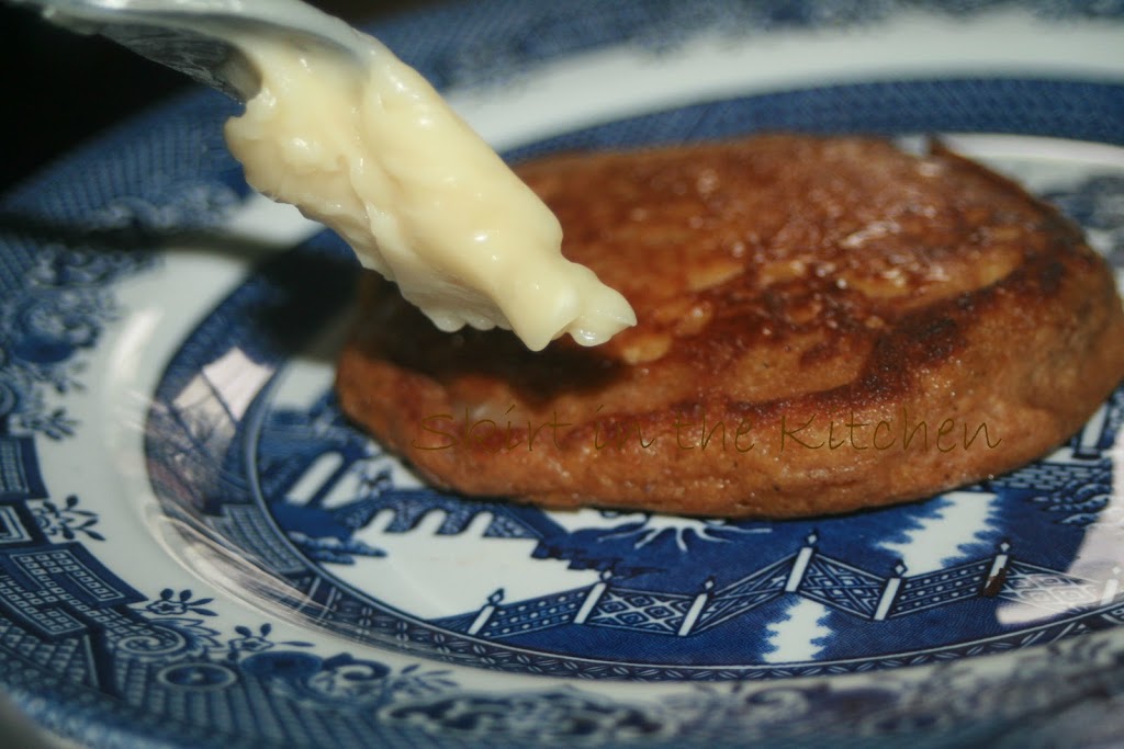 Heat a small skillet, add just enough butter to fry 1 pancake at a time. Keep warm in the lowest temp of the oven. Make the Honey Butter: 8 tablespoons softened unsalted butter, 1/3 cup honey. Drizzle a little agave nectar or pure maple syrup over hotcakes with pistachios and fig jam.