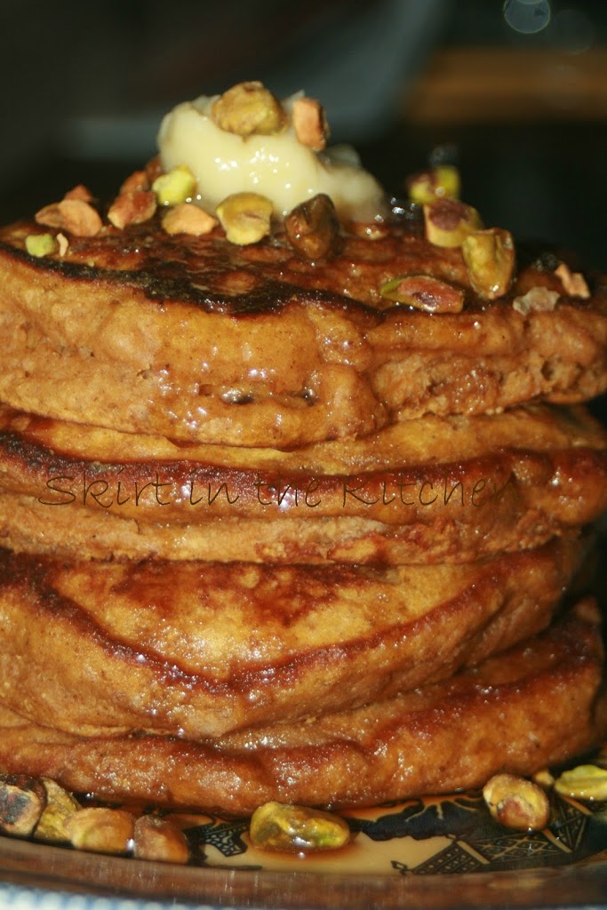 Pumpkin Pancakes with Honey Butter, Pistachios, and Fig Jam