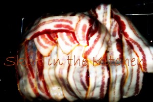 When the turkey has reached its last 30 minutes of baking, within the 30 minutes, wrap it entirely over the top and sides with applewood smoked bacon. Cook the bacon just until done, so it it still pliable, not shriveled and breaking apart.