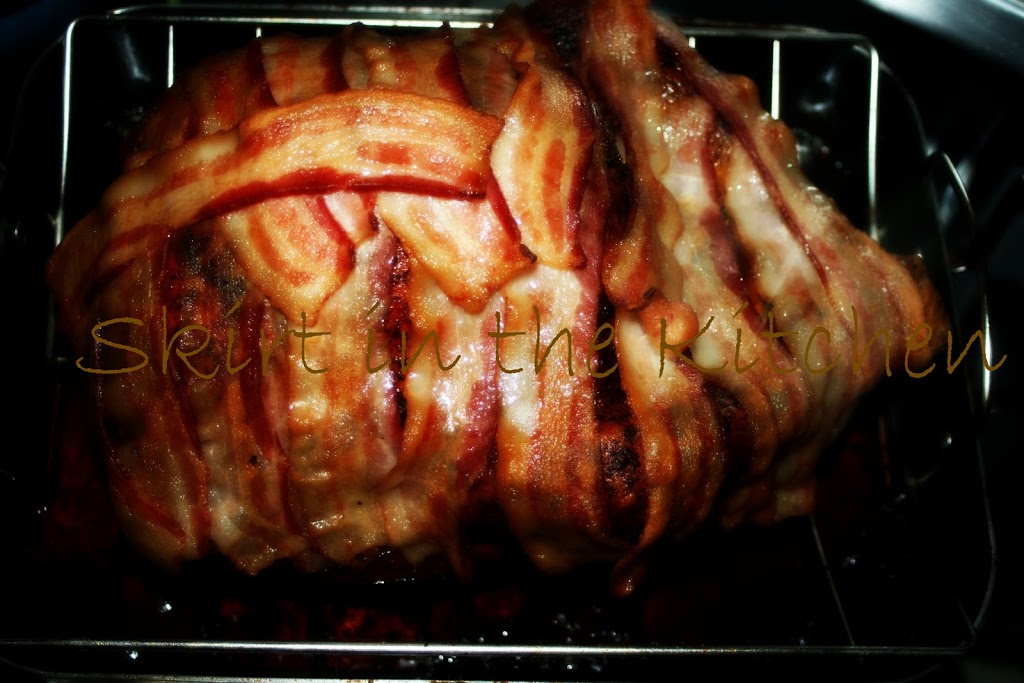 When the turkey has reached its last 30 minutes of baking, within the 30 minutes, wrap it entirely over the top and sides with applewood smoked bacon. Cook the bacon just until done, so it it still pliable, not shriveled and breaking apart.