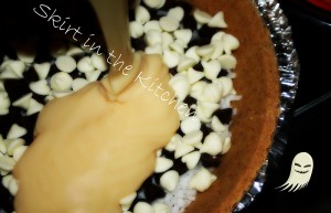 In a blender or food processor, crumble into smitherenes 4 whole graham crackers… or just do what I did– go easy on the baking tonight– Fill a store-bought graham cracker pie crust with 1/2 cup sweetened coconut. Up to you. But if you go the full baking route, Measure out 1 cup processed graham cracker crumbs; mix with 4 tablespoons unsalted melted butter. Put fingers into an 8-inch square baking dish, press gently to form the crust– then cover with coconut and have fun.
