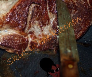 Remove meat from skillet, sauté 1 medium purple onion and 2 cloves Elephant garlic. Drizzle Worcestershire sauce and Girard’s brand champagne salad dressing, top and bottom, of arm roast resting in a roasting pan.