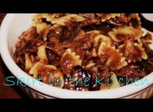 The same day or next, heat the broth in a heavy-bottom pan or skillet. Make into a gravy, stirring in the flour, first, then water– a little at a time. Make enough gravy for meat pieces and farfalle bowtie pasta to be added. But first, stir in Kitchen Bouquet Browning & Seasoning Sauce into the gravy. Taste for possible addition of salt and freshly ground pepper. When gravy has thickened just a little, stir altogether and serve.