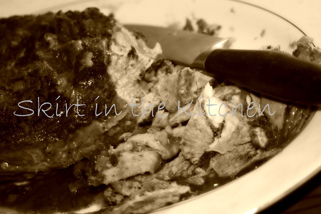 Immediately pour in equal parts tarragon vinegar, Girard’s Champagne Dressing and Worcestershire sauce, then ground horseradish; stir quickly to make a sauce. Pour all the contents over the roast, add more salt and pepper, cover with a lid and cook for 2 hours at 275 degrees.