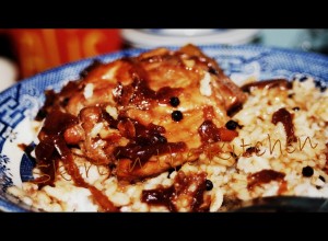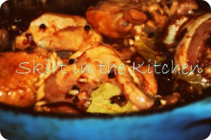Heat 1/3 cup distilled white vinegar (or rice vinegar) in a heavy pot or Dutch oven; with it, heat 1/2 cup soy sauce. Have ready to add into the sauce and vinegar– 1/2 of a yellow onion sliced or diced, 5 cloves chopped garlic, 1 inch long peeled and minced ginger.