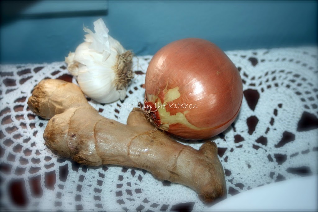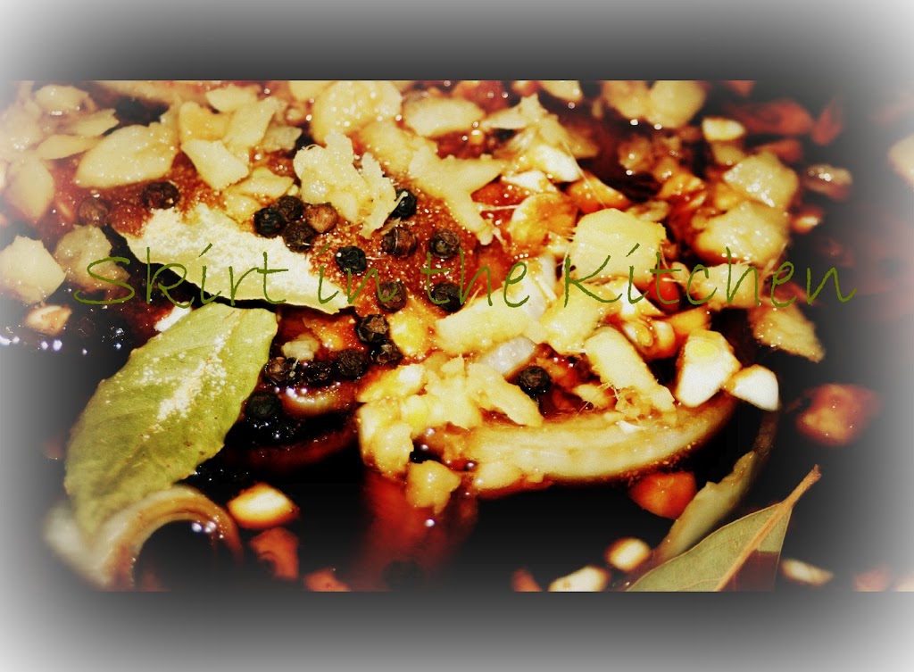 Heat 1/3 cup distilled white vinegar (or rice vinegar) in a heavy pot or Dutch oven; with it, heat 1/2 cup soy sauce. Have ready to add into the sauce and vinegar– 1/2 of a yellow onion sliced or diced, 5 cloves chopped garlic, 1 inch long peeled and minced ginger.