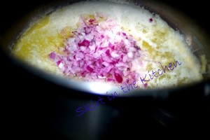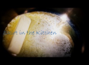 After the chicken has been baked and is resting to set up its juices, melt 1 stick unsalted butter in a heavy-bottom pan. Cook until tender–