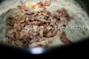 Stir in dark meat of the baked chicken, torn in small pieces– 1 cup. Add 1/8 teaspoon poultry seasoning, 1/8 teaspoon ground turmeric and 1/4 teaspoon Tabasco hot sauce. Taste for the right amount of salt and pepper, a little at a time. (The turmeric gives it a yellow color.)