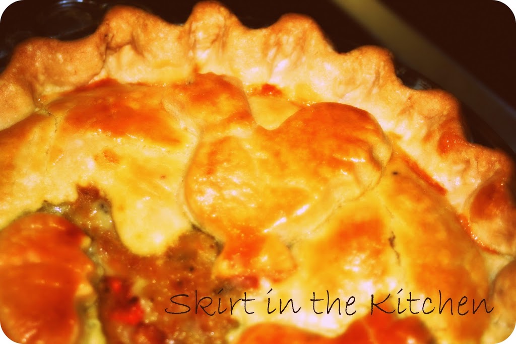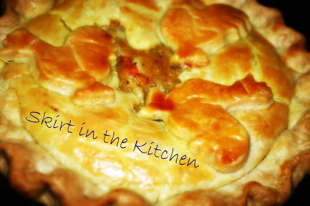 Roll out the dough and place into a pie plate; refrigerate while making the top crust. Then take out of the refrigerator and place the top crust in the ‘frig while you fill the bottom crust. Keep the crust chilled as much as possible, even right up to the point of crimping and cutting out the chickens with the cookie cutter; makes a prettier and more manageable dough. Add a little water to 1 whisked egg; brush lightly over the top crust but not on the edge.