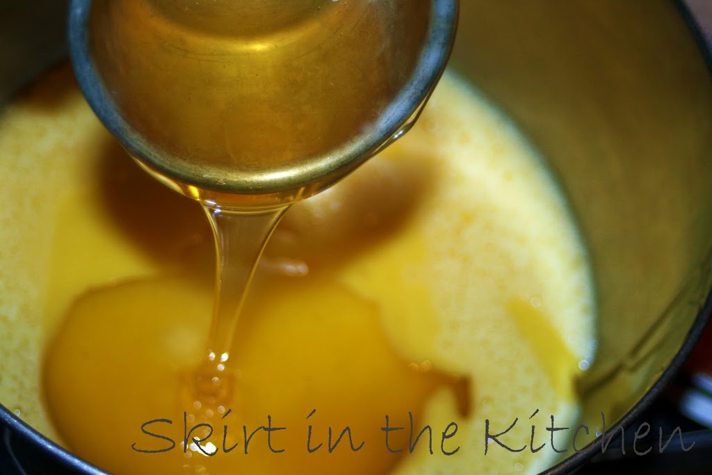 Into the beaten eggs in a large bowl, stir together with a whisk 1 cup sugar, 1/2 cup light-colored corn syrup and 1/2 cup honey.