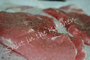 Wash 4 boneless pork chops, fat trimmed. Pat dry; salt and pepper both sides of each, fry in 2 tablespoons olive oil on medium-high heat– 6 minutes on each side before flipping. Place on a foil-tented platter to keep warm.