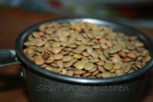 Stir 1 cup dried lentils into boiling water. Turn heat down to a rolling simmer and cook for 25 to 30 minutes. Drain and allow to cool completely for 30 minutes.