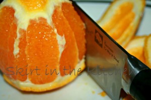 Cut the peel and pith from 2 oranges. Reserve juices when cutting into quarters, needing 1/4 cup juice to stir into the lentils. Slice each quarter crosswise into 1/4-inch slices.