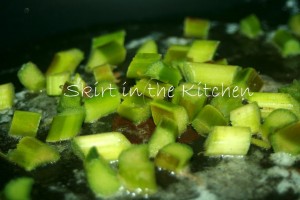 In unsalted butter and olive oil, on medium heat, saute rhubarb.