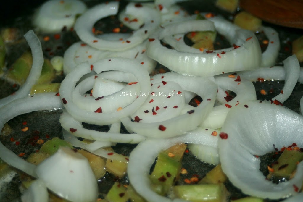 In unsalted butter and olive oil, on medium heat, saute rhubarb.