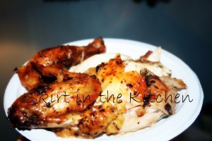 Baste with pan juices halfway through baking time and rotate the pan to cook meat evenly. Roast approximately 1 hour, until thighs register on a meat thermometer the temperature of 175 degrees.