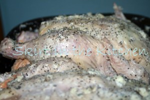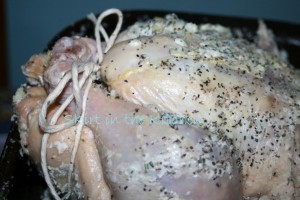 Place 2 cloves garlic in each cavity; tie legs with meat twine.