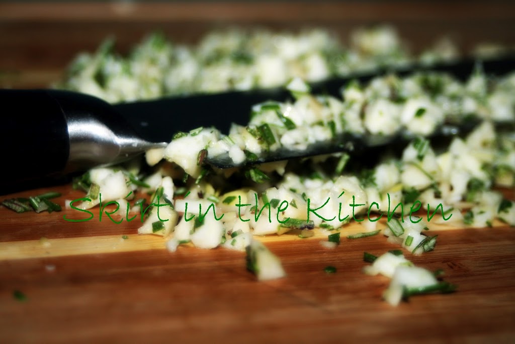 Preheat oven to 400 degrees, begin to coarsely chop 4 garlic cloves.
