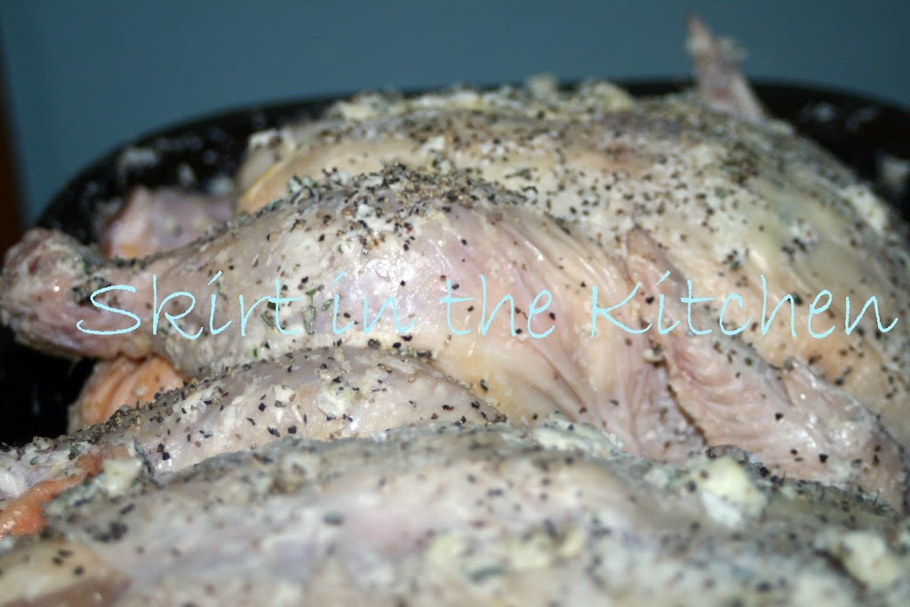 Combine garlic-rosemary mixture with 6 tablespoons salted butter at room temperature. Apply under the skin of the chicken breasts, then the circumference of 2 whole fryers (4 lbs each). Season chickens inside cavities and outer portions with salt and pepper.