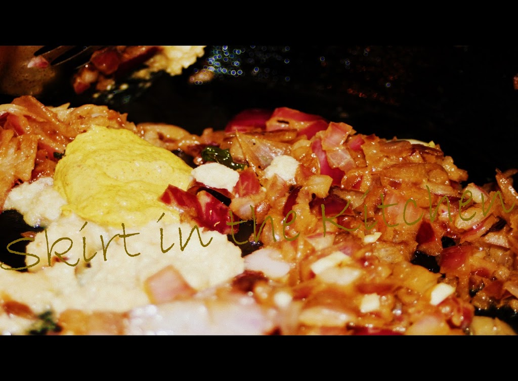 In the same skillet, now empty, melt 1/2 stick unsalted butter and saute the purple onion until tender.  Also stir in new garlic, finely chopped, towards the end of onions cooking tender so that the garlic does not burn.