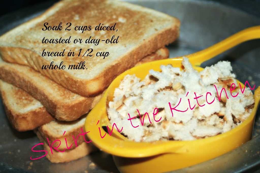 Finely chop 2 tablespoons flat-leaf parsley. Work seasonings into 1 1/2 pounds ground chuck and the bacon. Add 2 eggs, 1/4 teaspoon black pepper, and 2 teaspoons plus 3/4 teaspoons salt. Using paper towels, squeeze excess milk from the bread– add saturated bread to meat mixture.
