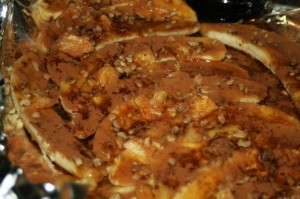 Cover with dark brown sugar, ground cinnamon, wild black walnuts, and minced ginger root. Dot with butter.