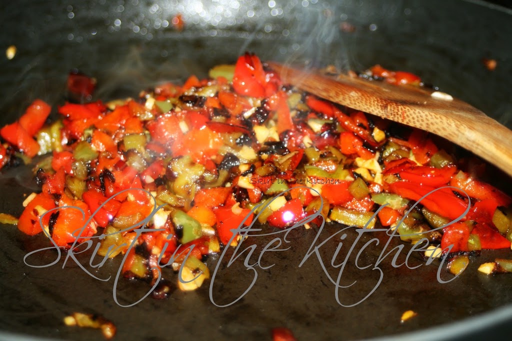 Sauté 1 chopped red bell pepper, 1 green bell, and 2 finely diced or minced jalapenos. Transfer to a slow-cooker. Add 2/14.5-ounce cans diced tomatoes, juice included.