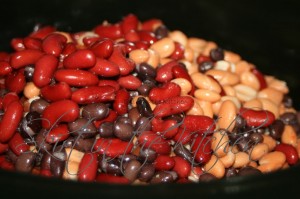 Drain, rinse, and add beans– 1 15-ounce can each: pinto, black, dark red kidney.