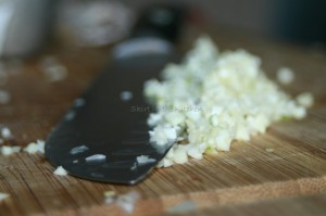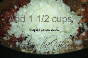 Stir in spices and seasonings of: 1 tablespoon chili powder, 6 cloves minced or finely chopped garlic,