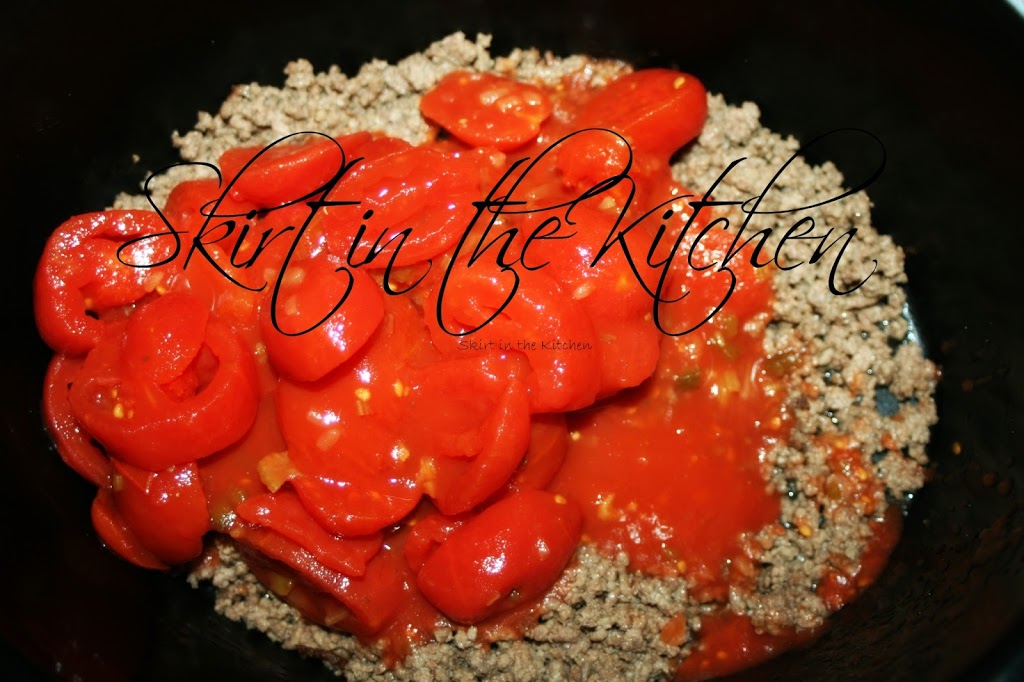 Brown 1 pound lean ground beef, drain off the fat. Transfer meat to a slow cooker and add 2 14.5-ounce cans fire-roasted tomatoes (juice included).