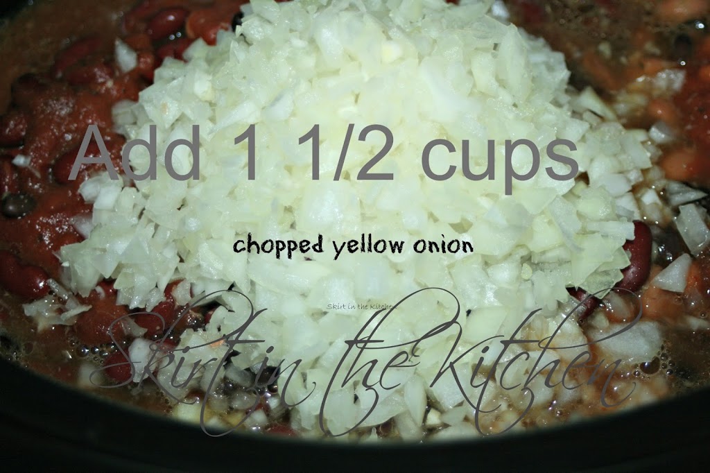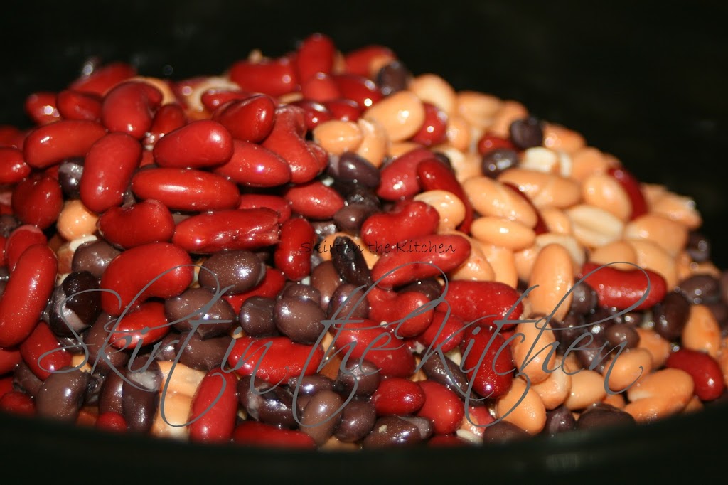 Drain, rinse, and add beans– 1 15-ounce can each: pinto, black, dark red kidney.