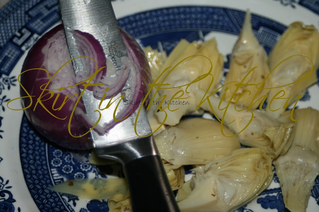 Drain 1 can, 7.5 ounces, artichoke hearts.