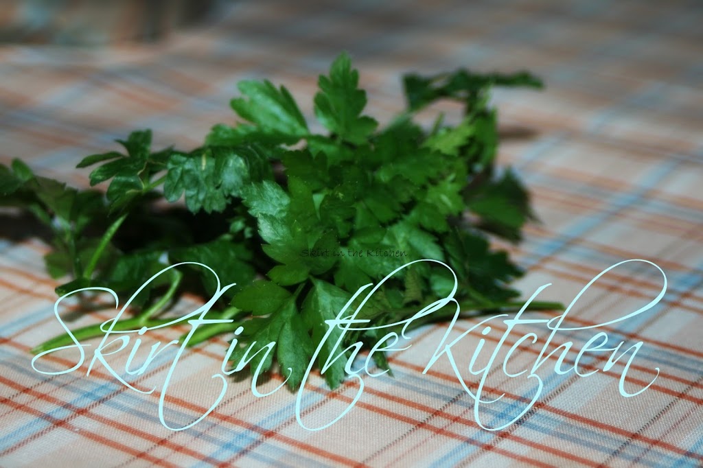 Stir in torn flat-leaf parsley into blended eggs.  Pour the egg mixture into the skillet, cook until just set, not all the way through in the middle.