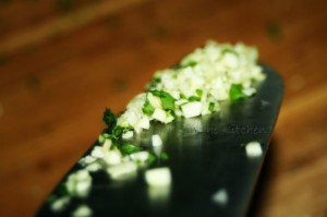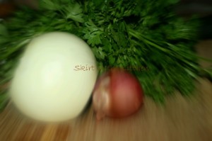Chop 1 yellow onion, 1 shallot, then parsley for 1/2 cup;