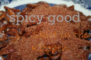 In a small bowl, blend together 1/4 cup firmly packed brown sugar, 1 teaspoon garlic salt, 1 teaspoon chipotle chili powder, and 1 teaspoon smoked paprika.  In a separate bowl, beat 1 egg white until frothy.  Coat pecans in beat egg white.  Then put pecans into spices.  Spread in a single layer onto the bar pan.  Bake 45 minutes.  Cool on the pan for 1 hour.  (Pecans can be stored up to 1 week in a cool area in an airtight container.)