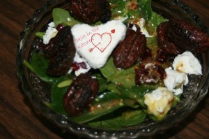 In a large bowl, combine together 12 ounces fresh spinach, 6 ounces crumbled goat cheese,