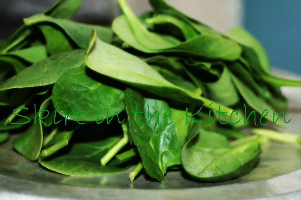 In a large bowl, combine together 12 ounces fresh spinach, 6 ounces crumbled goat cheese,