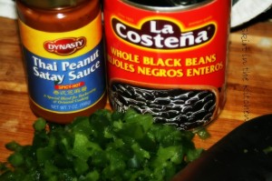 Into mashed black beans, mash to work in 1/3 cup Thai Peanut Satay Sauce.