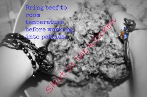 To work ingredients into 2 pounds (80% lean chuck) beef equally for even distribution of flavors, place half the amount of meat in the bowl, then half of the cooked mixture, and half of the sauce and bean mixture. Massage into meat; repeat cycle with only 1 light sprinkle of coarse salt, then form into patties. Fry in 1 tablespoon hot olive oil on medium-high heat.